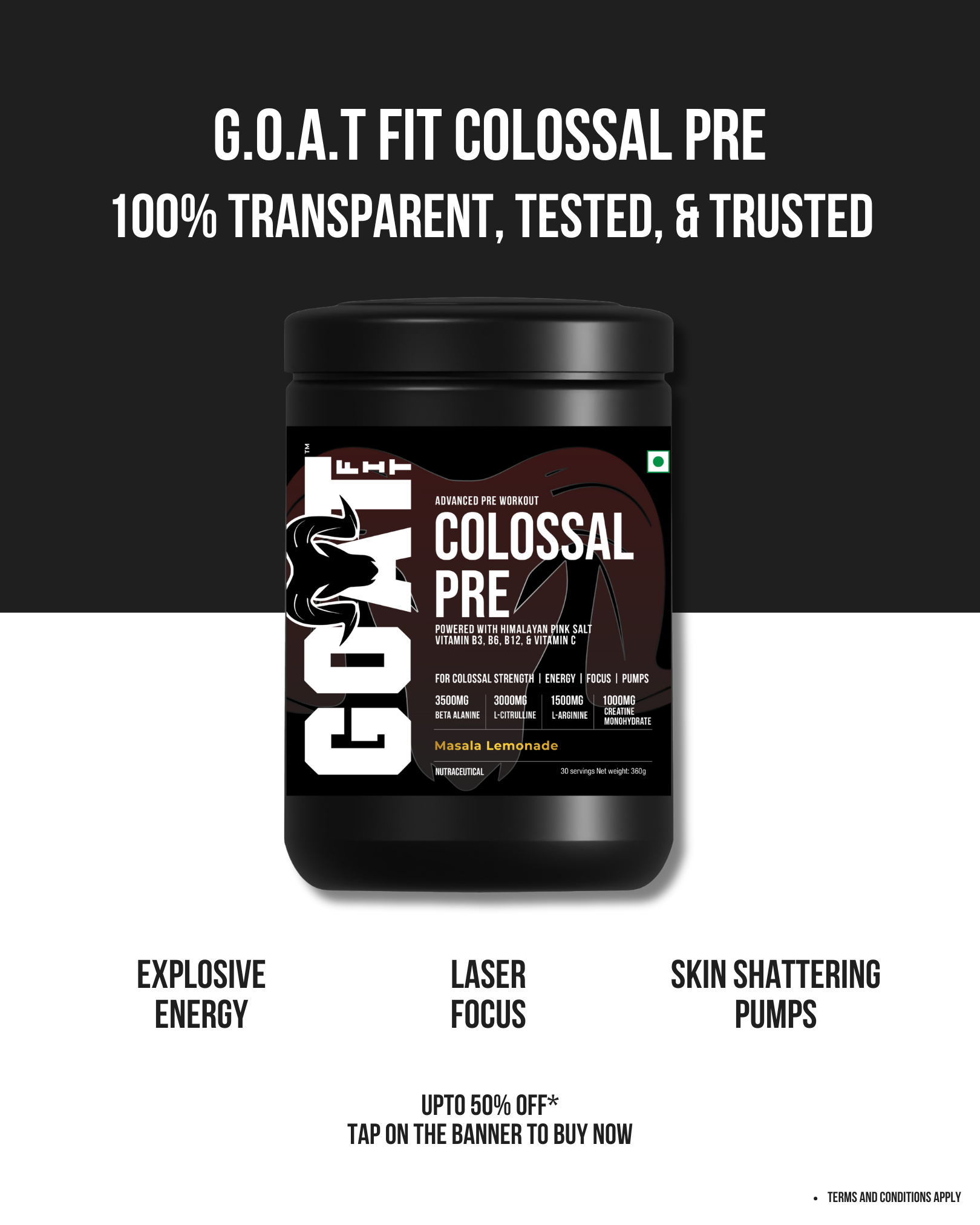 Colossal Pre - Masala Lemonade | Advanced Pre Workout for Colossal Strength, Energy, Focus and Pumps | 30/60 servings - 360gms