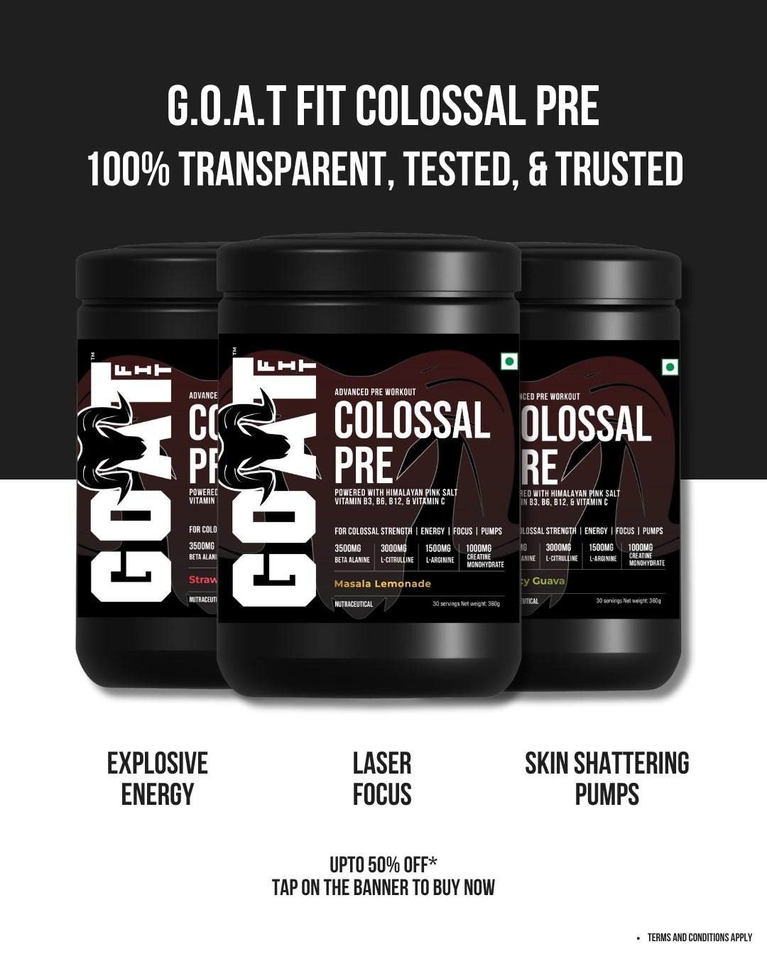 Colossal Pre - Masala Lemonade | Advanced Pre Workout for Colossal Strength, Energy, Focus and Pumps | 30/60 servings - 360gms